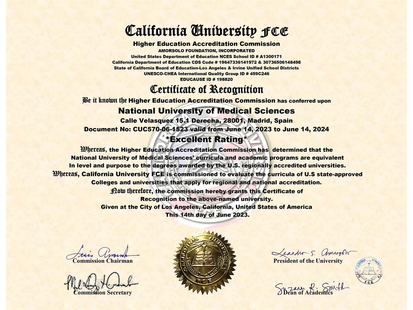 We are happy to announce that the Higher Education Accreditation Commission of the California University Foreign Credential Evaluation has issued a “Certificate of Recognition” to National University of Medical sciences (Spain). This certificate means that our academic programs are equivalent in level to degrees awarded by the US States Approved universities.