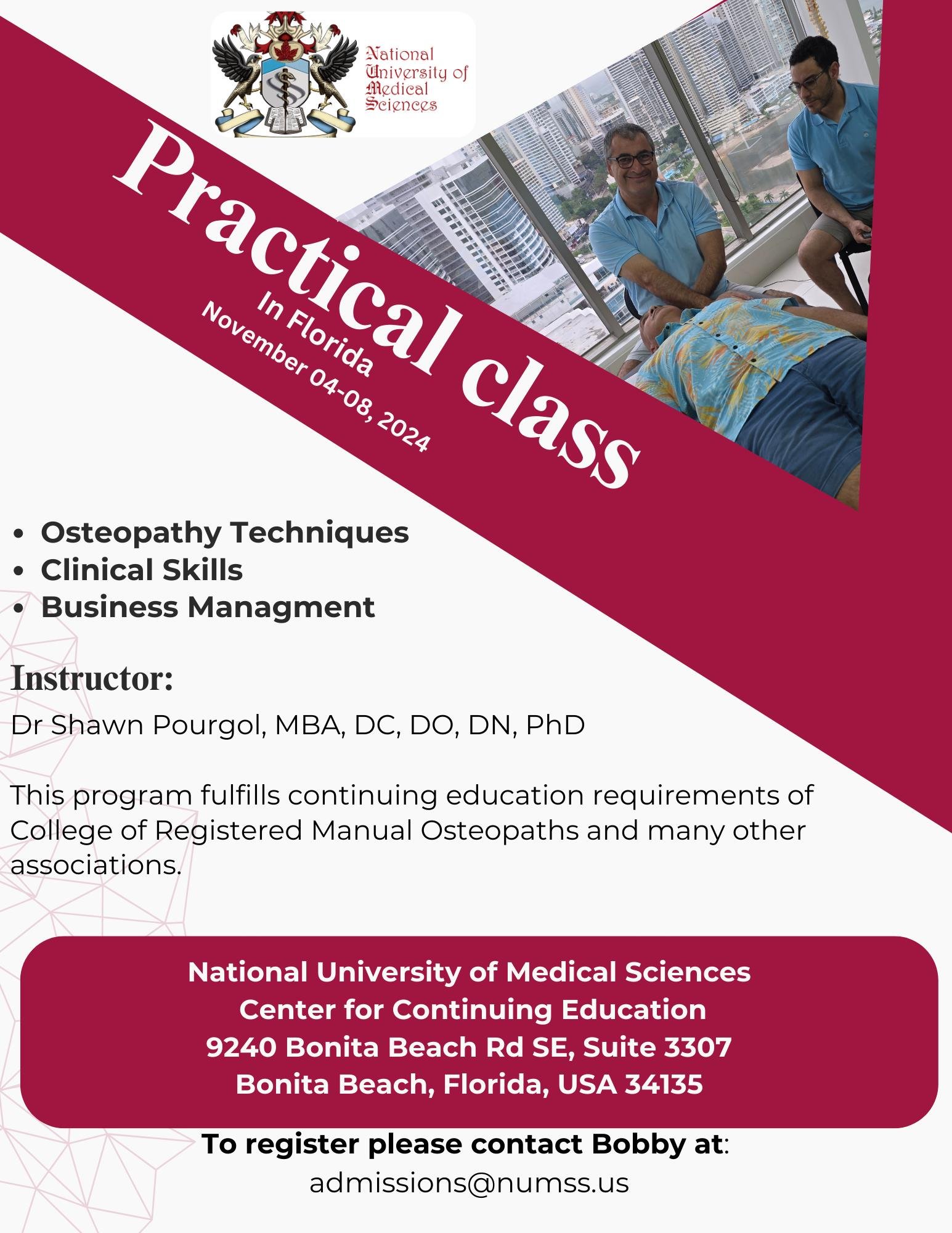 The practical technique class at the Waterfront Center for Continuing Education of National University of Medical Sciences – USA in Bonita Springs, Florida, is confirmed for November 4 to 8, 2024. This continuing education program will focus on manual osteopathy techniques, osteopathic clinical skills, and business management, with a particular emphasis on advanced tax planning strategies.