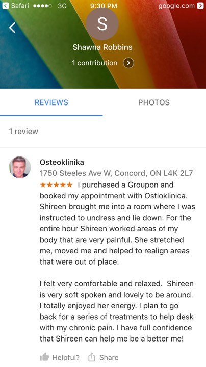 Here is a testimonial she received from her patient Shawna Robbins that is suffering from chronic pain. Osteopathy offers the most effective treatment system for chronic pain. Most patients manual osteopaths see are the last resort cases. They truly do miracles with their hands, treating cases where all else failed.