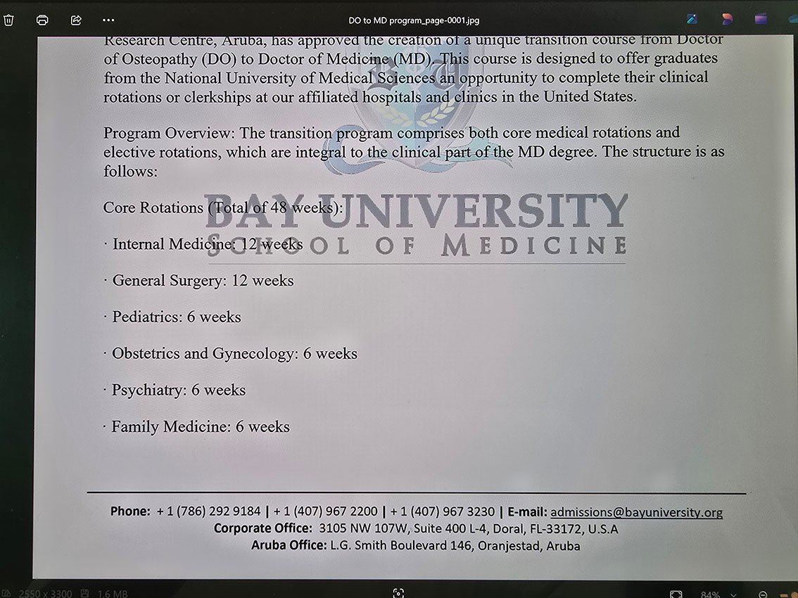 We are pleased to announce that Bay University School of Medicine in Aruba has developed an accelerated bridge program exclusively for Doctor of Osteopathy (DO) graduates from the National University of Medical Sciences (NUMSS) in Spain.