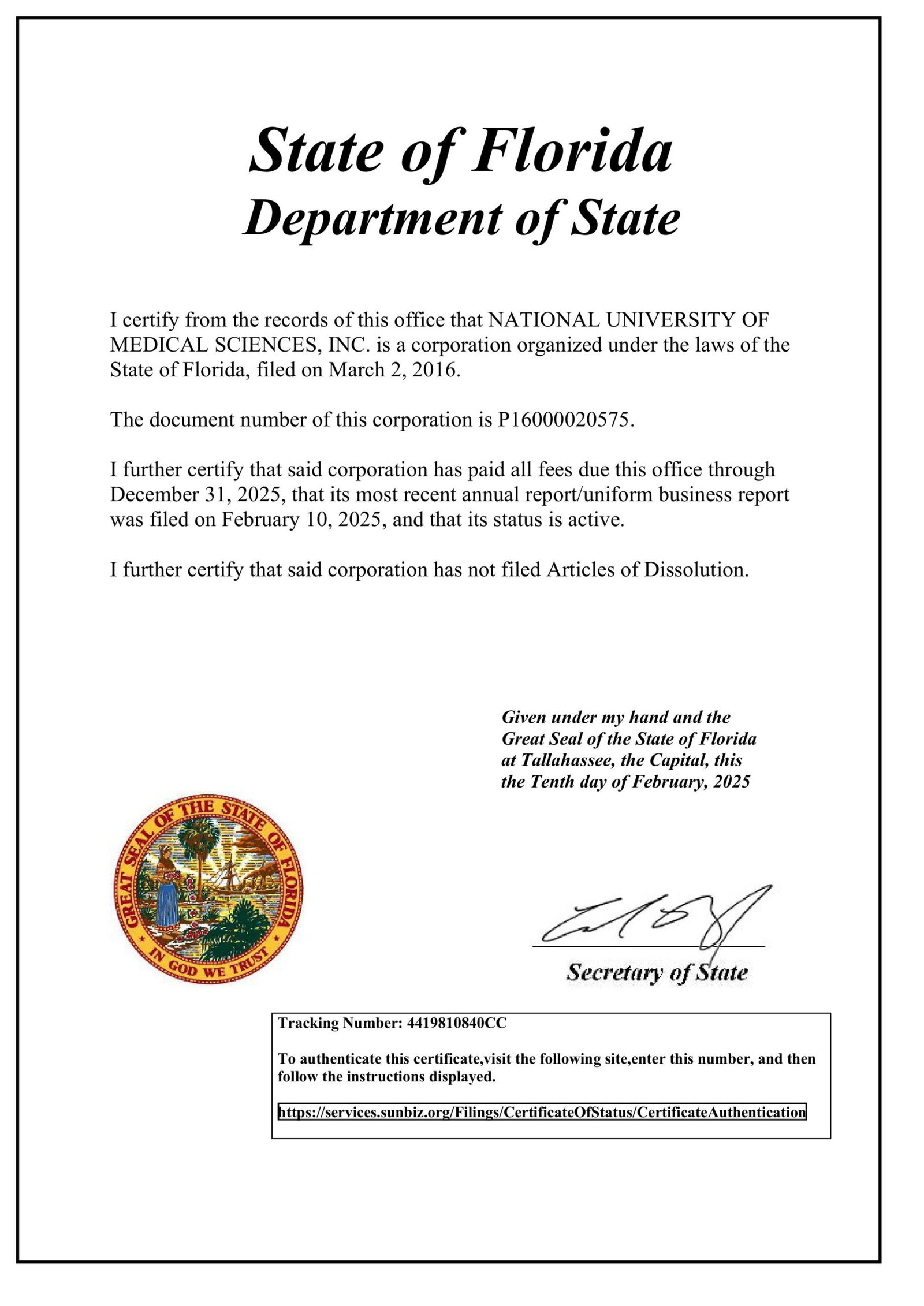 Founded in Florida in 2016, NUMSS (USA) is proud to announce that its registration license has been successfully renewed for another year on February 10, 2025 by the Florida Department of State!