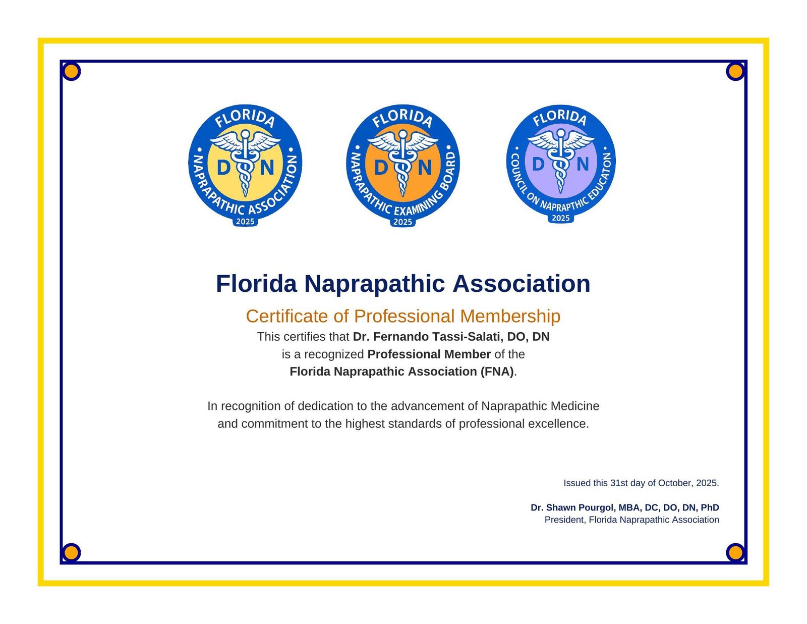 Italian naprapath, Professor Fernando Tassi-Salati, PT, DO, DN, (a professional member of Florida Naprapathic Association) teaches the popular Advanced Naprapathy Techniques course in the online Doctor of Naprapathy (DN) program we offer at the National University of Medical Sciences (Spain & USA). He credits his NUMSS education for helping him secure a high-paying job at a prestigious health center in Abu Dhabi, UAE.