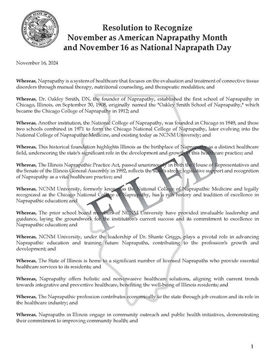 We would like to extend our heartfelt congratulations to our dear friend, Dr. Shante Griggs, naprapath and president of the American Naprapathic Association as well as NCNM University (formerly the National College of Naprapathic Medicine). Dr. Griggs has achieved a remarkable milestone by successfully filing a resolution with the State of Illinois to officially recognize November as American Naprapathy Month and November 16th as National Naprapath Day!