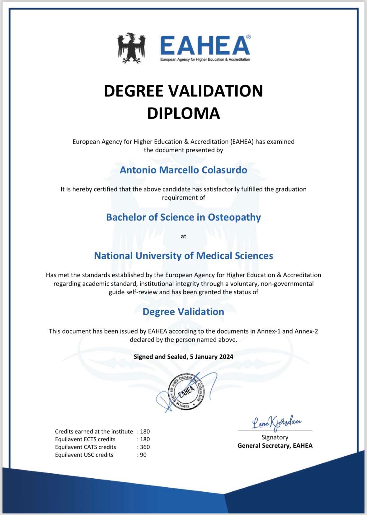 Congratulations to Canadian osteopath, Antonio Marcello Colasurdo, a graduate of the National University of Medical Sciences for getting Western University in Canada accept his Bachelor of Science in Osteopathy program – BSc (Ost), as a prerequisite towards the postgraduate Pedortics program offered by Western University.