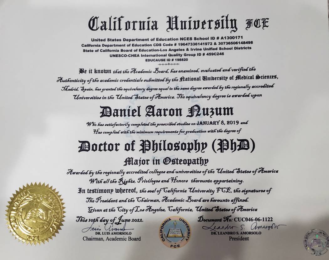 The Doctor of Philosophy (PhD) program in Osteopathic Clinical Rehabilitation that we offer at National University of Medical Sciences (Spain) has been evaluated and approved in the United States by the California University Foreign Credential Evaluation agency.