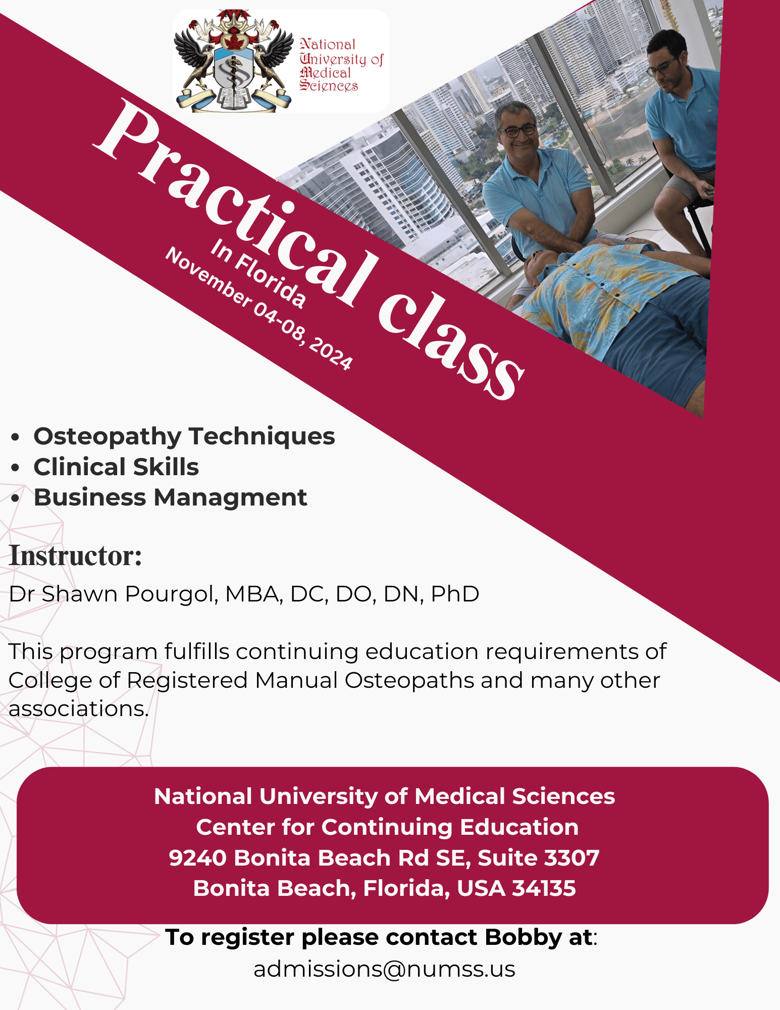 This practical class is open to everyone, not just NUMSS students. The program is recognized by several associations, including the American Association of Osteopathic Manual Practitioners, the Canadian Alliance of Alternative Medicine (ACMA), and the College of Registered Manual Osteopaths, all of which accept it towards their continuing education requirements.
